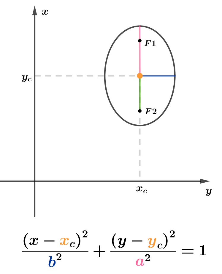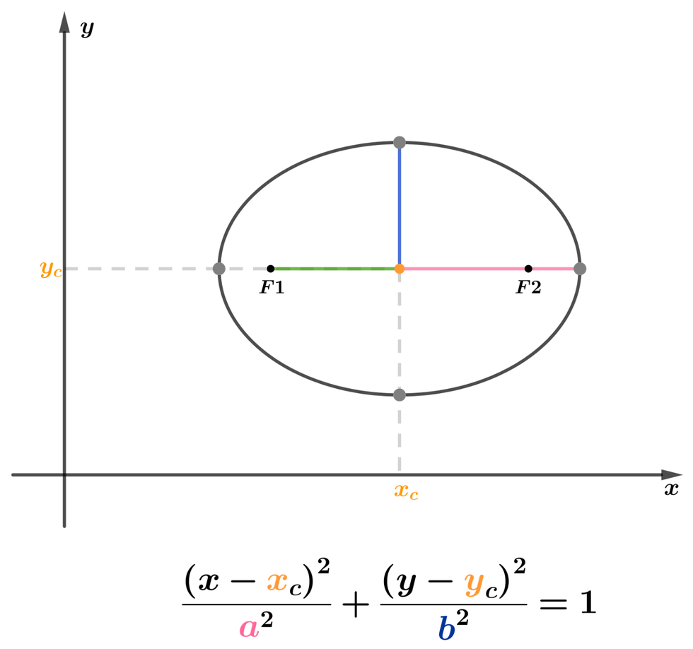 Fixados 2 pontos chamados de focos (F1 e F2) em que a distância entre eles é 2c, elipse é o lugar geométrico de todos os pontos cuja soma da distância de cada ponto a F1 e F2 é maior que 2c e vale 2a.