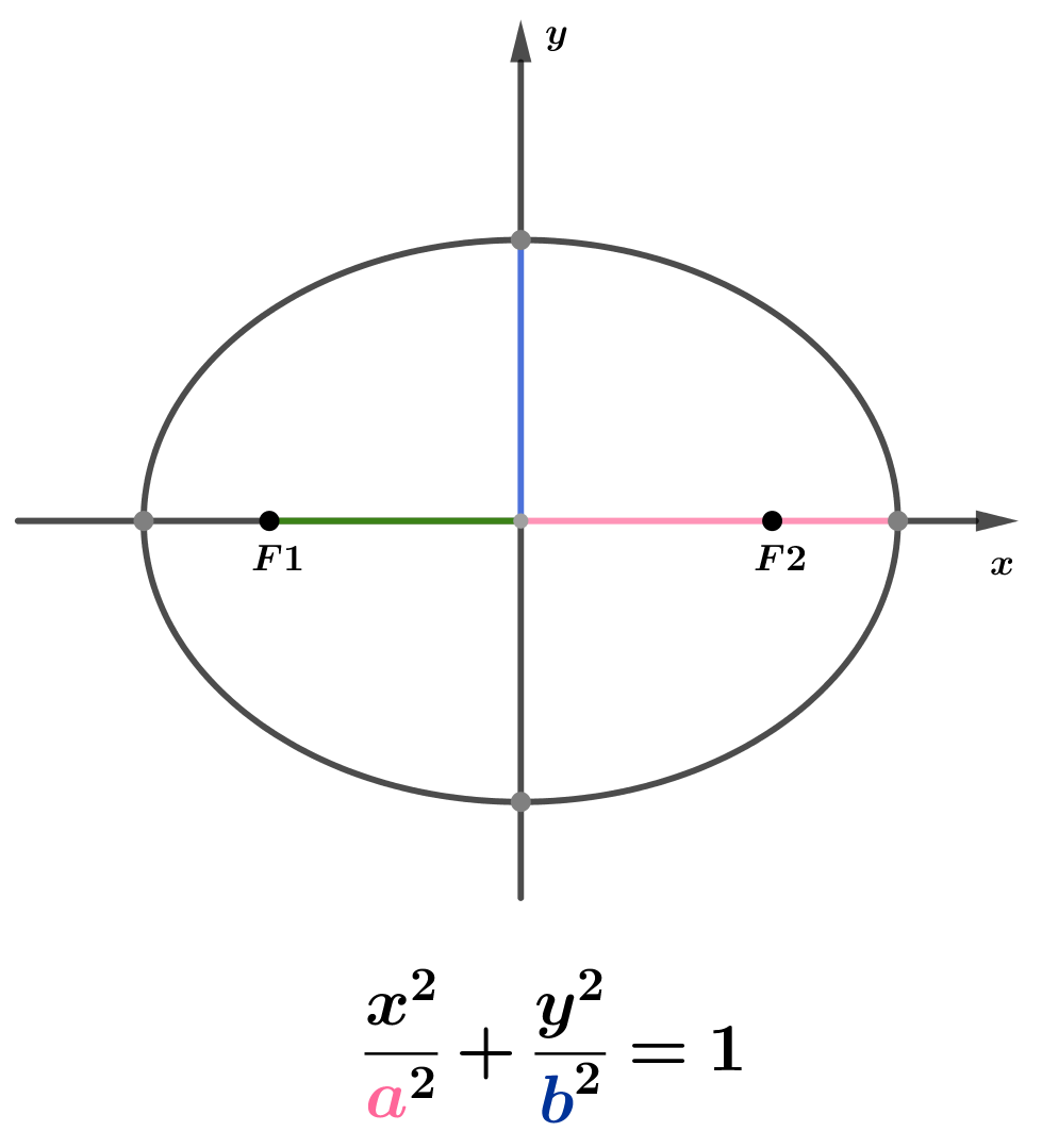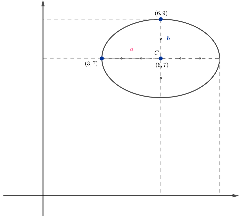 A elipse possui um eixo maior e um menor. A distância do centro ao eixo maior é o valor de a. A distância do centro ao eixo menor é o valor de b.